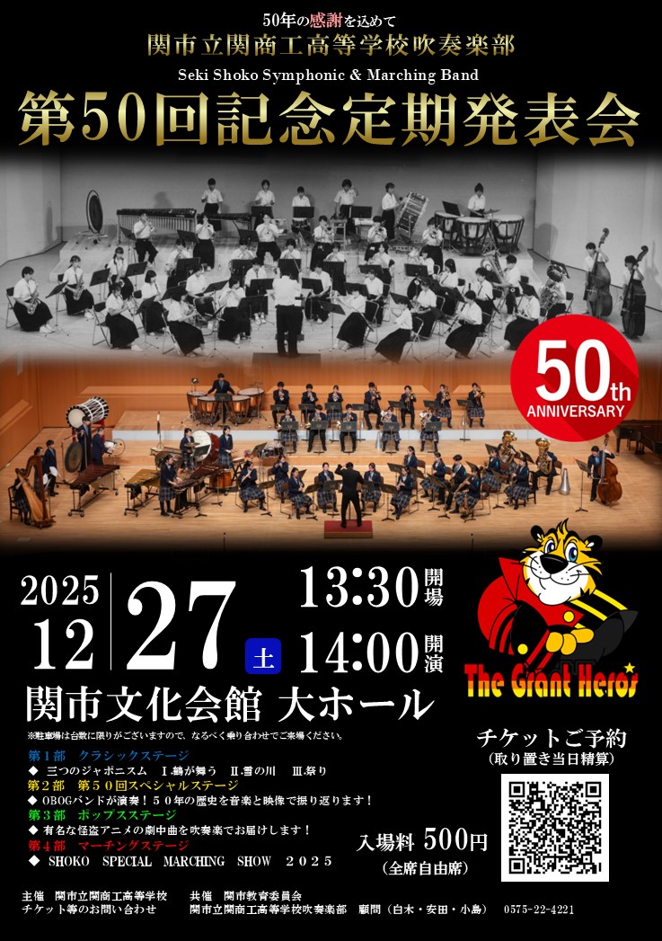 1961年に創部された伝統ある関市立関商工高等学校吹奏楽部は、部訓「人の和 即 音の和」のもと、総勢43名の部員が同じ目標に向かって、有意義に活動しています。吹奏楽やマーチングバンドの大会に出場するだけでなく、地域イベントでの演奏や小学校・中学校への招待演奏会など年間を通して多数のコンサートを開催しています。部活動の方針や運営、練習の段取りや演奏会の企画など、すべて生徒が主体となって活動しており、様々な困難を乗り越えながら3年間で大きく成長します。ここで得た「経験」と仲間との「和」が一生の宝になります。