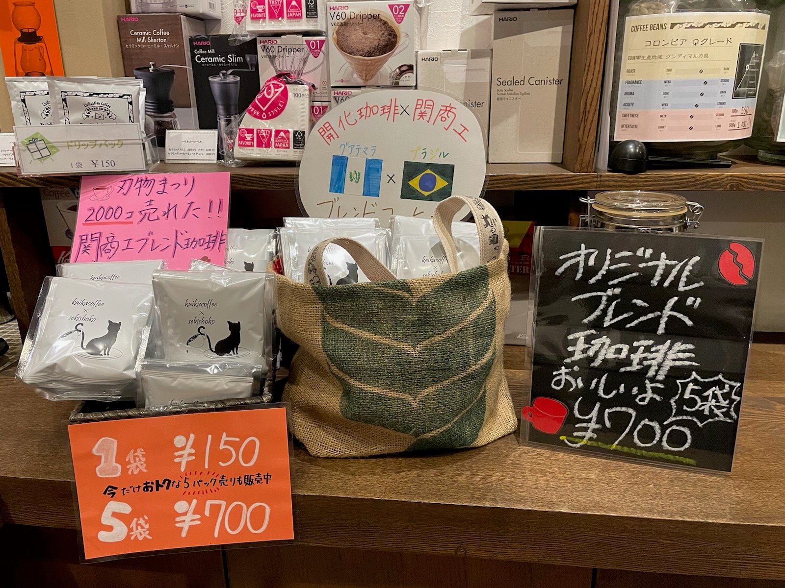 商業科ニュース R4商業科ニュース 関商工ブレンド(珈琲)の販売について 刃物まつりで販売した「関商工ブレンド」珈琲を、開化珈琲さんの店舗で販売しております。生徒がデザインをした猫の絵のパッケージデザインが、開化珈琲さんの落ち着いた雰囲気にぴったりです。商工生がブレンドした香り深い珈琲を是非お買い求めください。 tagPlaceholderカテゴリ: