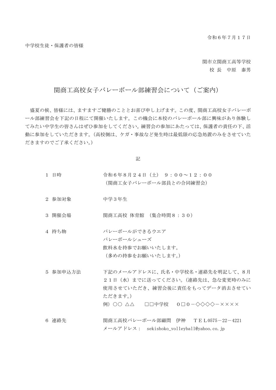 学校からの案内 中学生の皆さんへ 女子バレーボール部練習会について(ご案内) 女子バレーボール部練習会について(ご案内).pdf PDFファイル 79.8 KB ダウンロード tagPlaceholderカテゴリ: 学校からの案内
