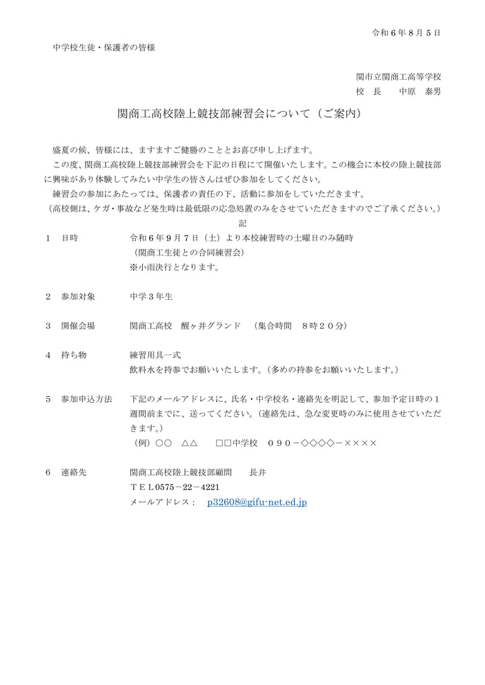 学校からの案内 中学生の皆さんへ 陸上競技部練習会について(ご案内) 陸上競技部練習会について(ご案内).pdf PDFファイル 94.9 KB ダウンロード tagPlaceholderカテゴリ: 学校からの案内