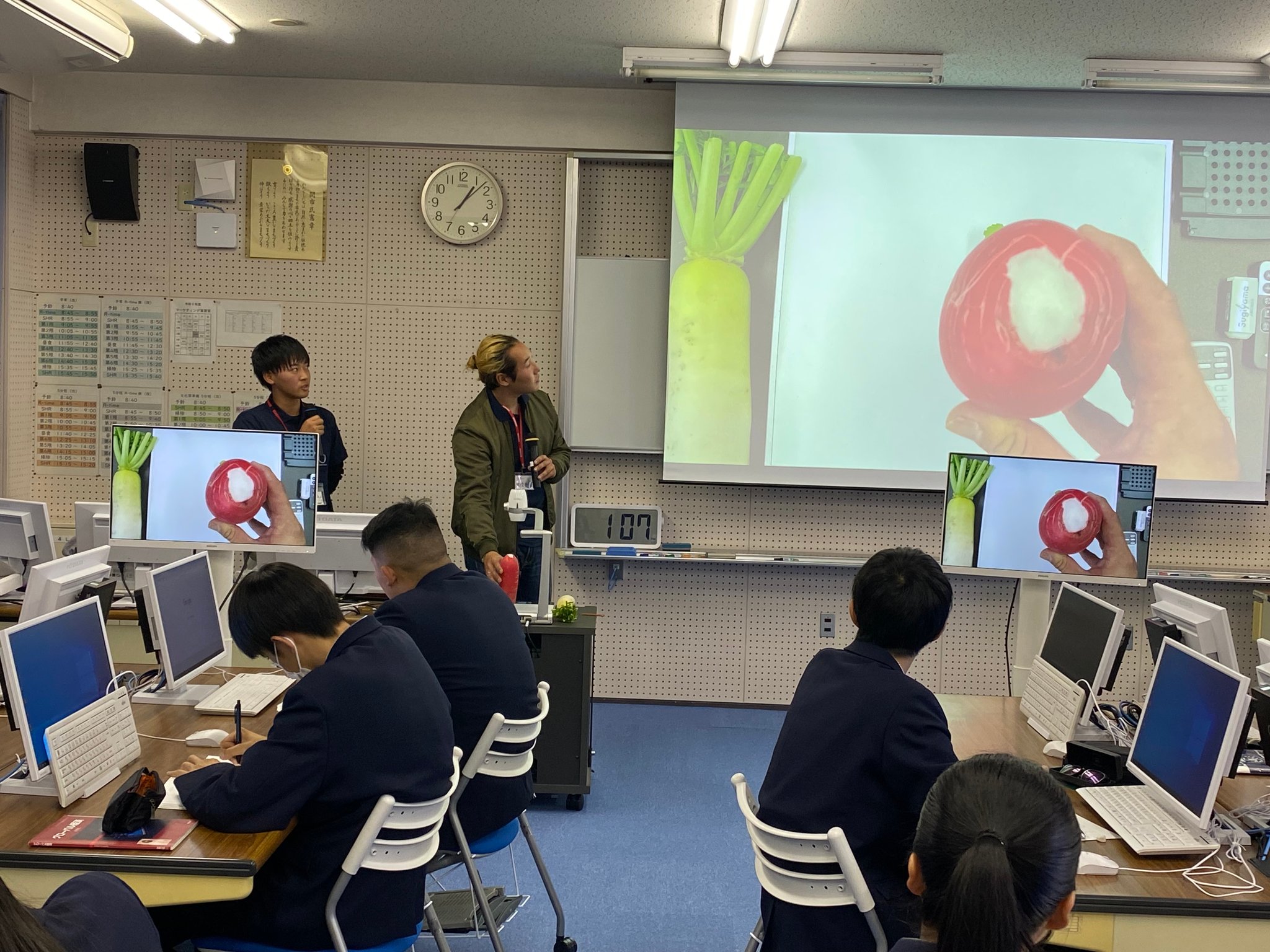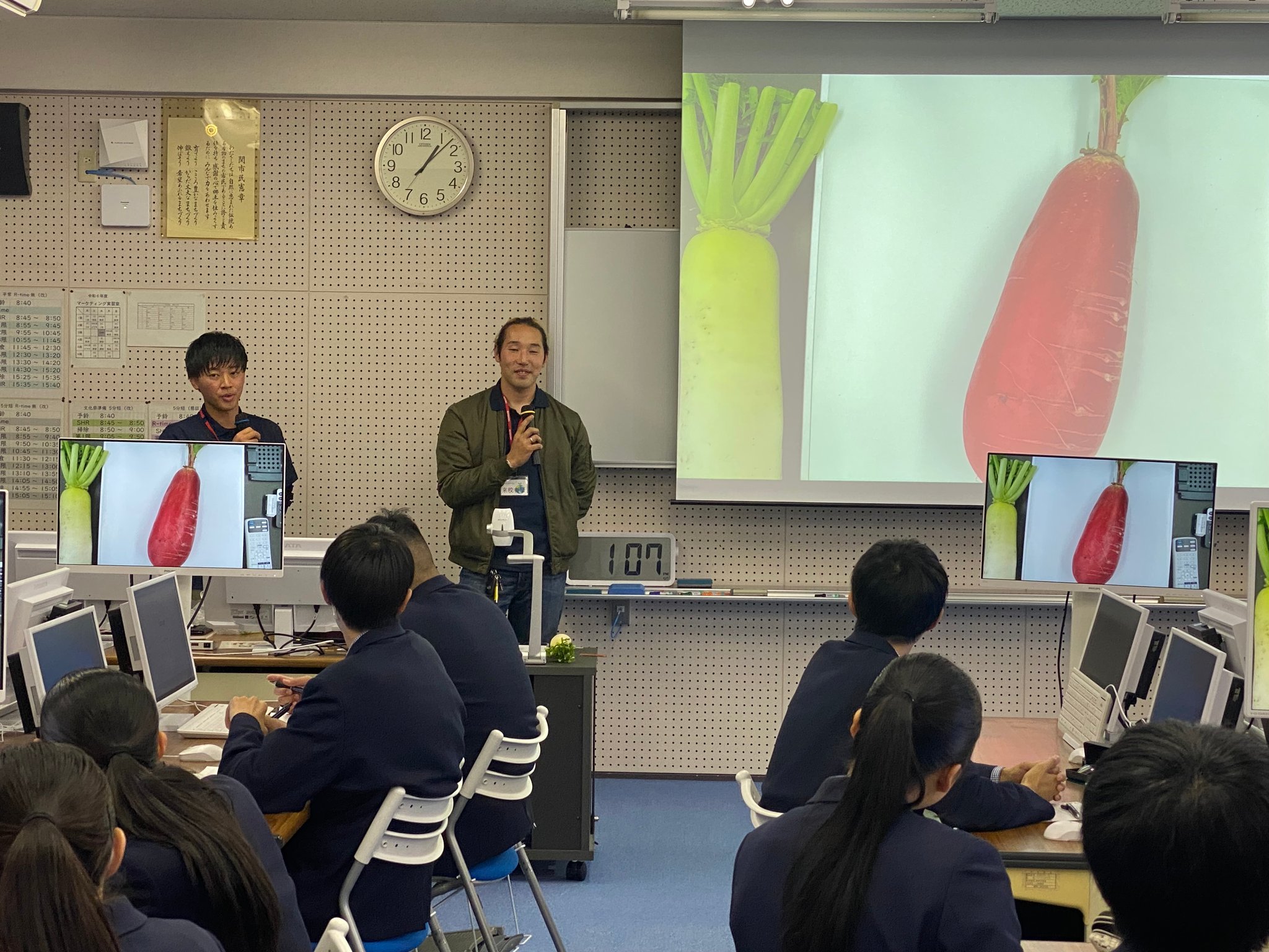 12月4日(水)3年生課題研究(地域協働)チームは、岐阜県商業達人カップで販売するゆず鍋セットの白菜と大根の生産者であるたわらファームの川村様とBCKS村の多田様にお越しいただき、ご講演をいただきました。岐阜県商業達人カップに向けて商品の知識をつけ、お客様に良い商品であることをアピールできるよう準備をしていきます。