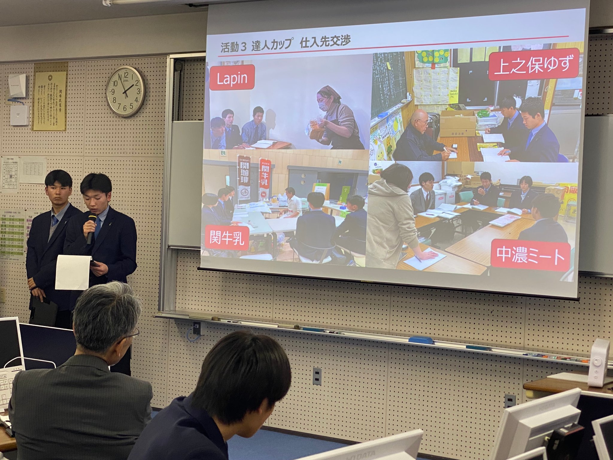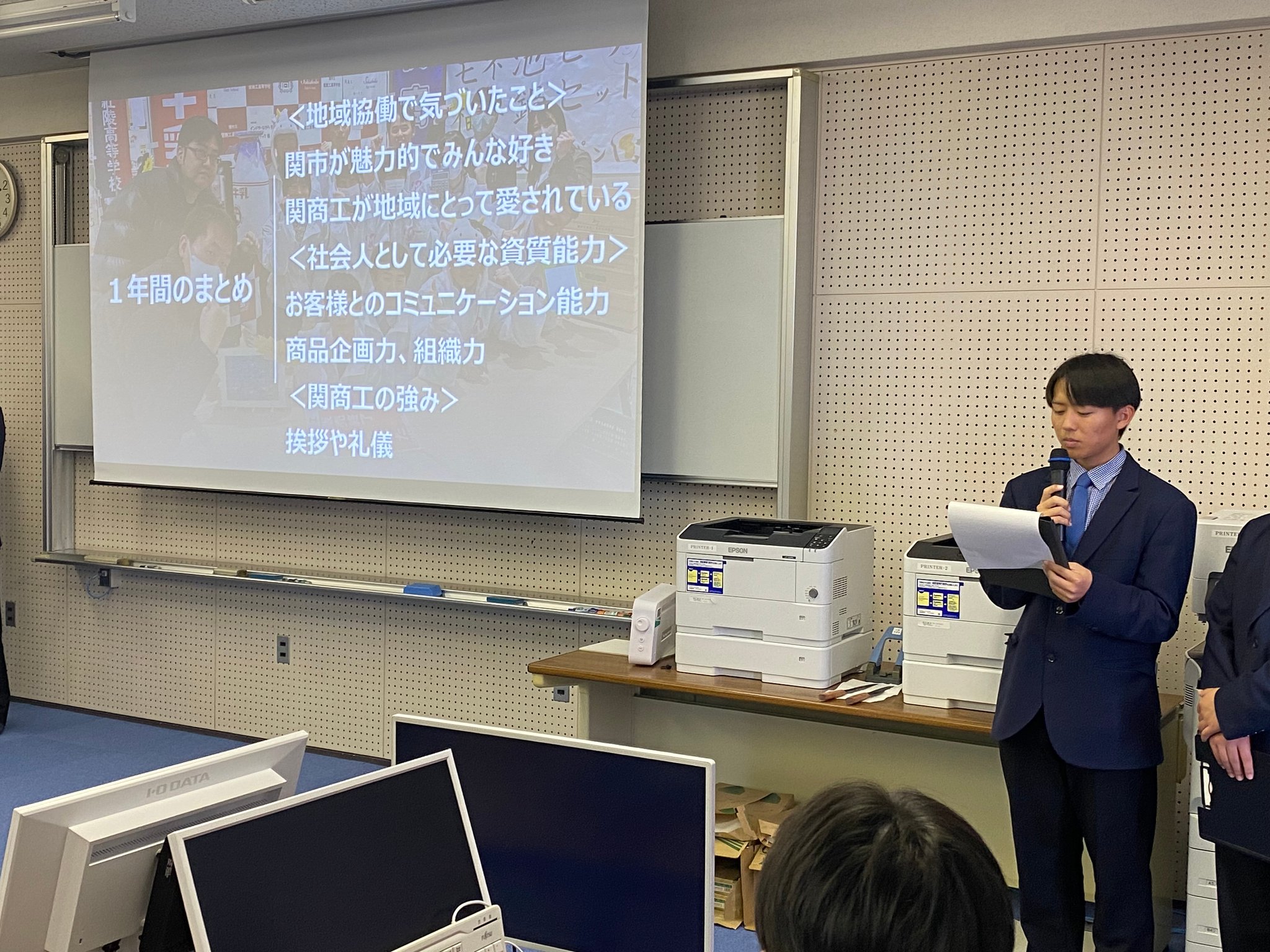 商業科ニュース R6商業科ニュース 課題研究(地域協働探究)課題研究発表会 1月22日(水)に、総合ビジネス科3年生課題研究(地域協働探究)チームは、㈱ヤマジの山中様、㈱シズテックの堀部様をお迎えして、課題研究発表会を実施しました。アクア・マルシェや刃物まつり、達人カップなどこれまでの販売実習の成果と課題、地域協働とは何かなど、1年間の取り組みをまとめた発表を代表生徒が堂々と行いました。今後は1,2年生向けに課題研究発表会を実施し、これまでの取り組みの成果と課題を後輩に引き継いでいきます。 tagPlaceholderカテゴリ: 商業科ニュース